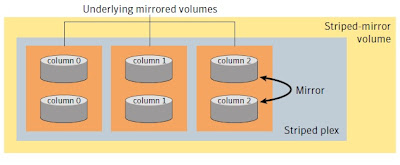 In this volume,two mirrored volume will form form a two sub-volumes.These sub-volumes will from striped plex.Its an example of layered volume.